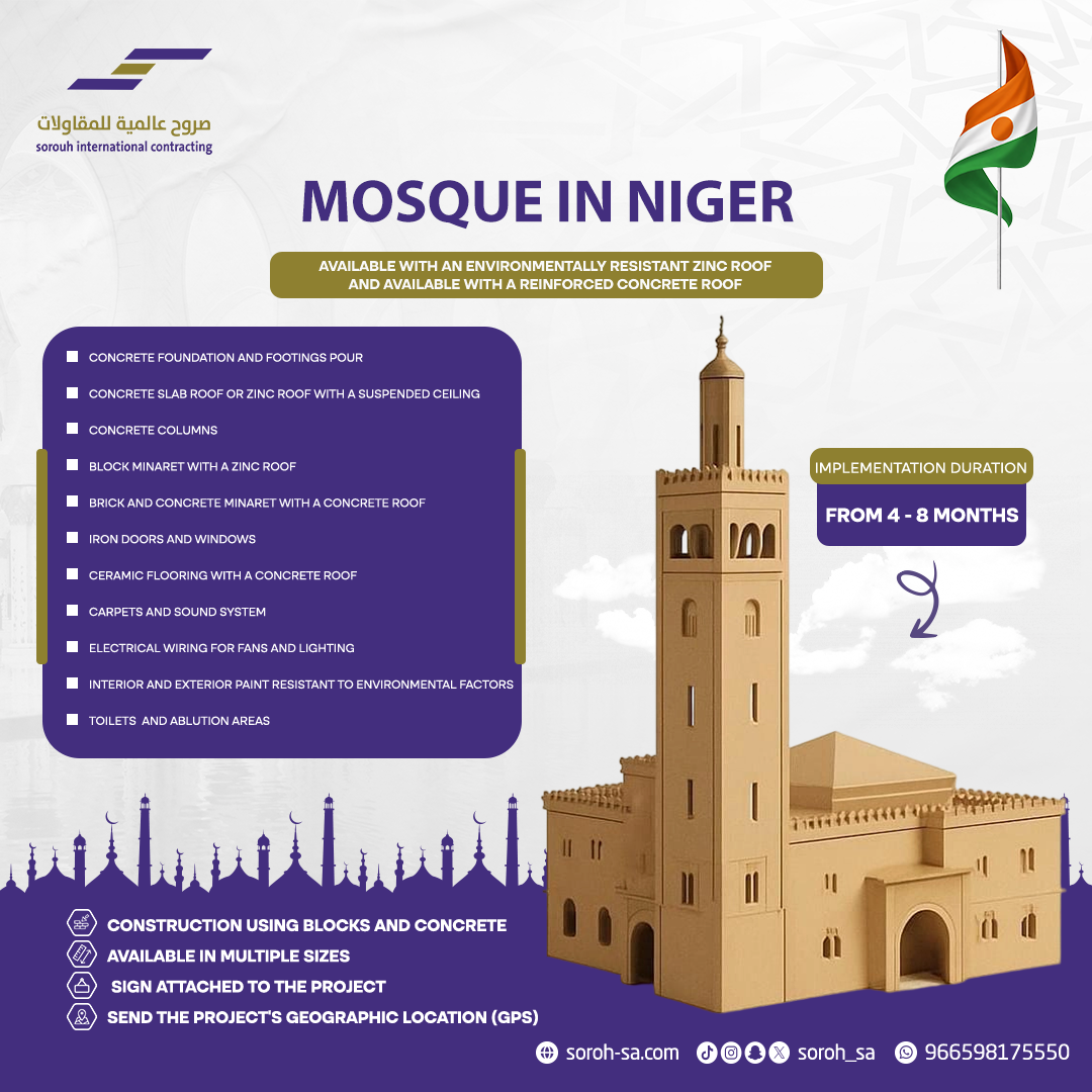 Mosques with zinc or concrete roofs are available in Niger, with zinc roofs resistant to environmental factors and reinforced concrete roofs also available