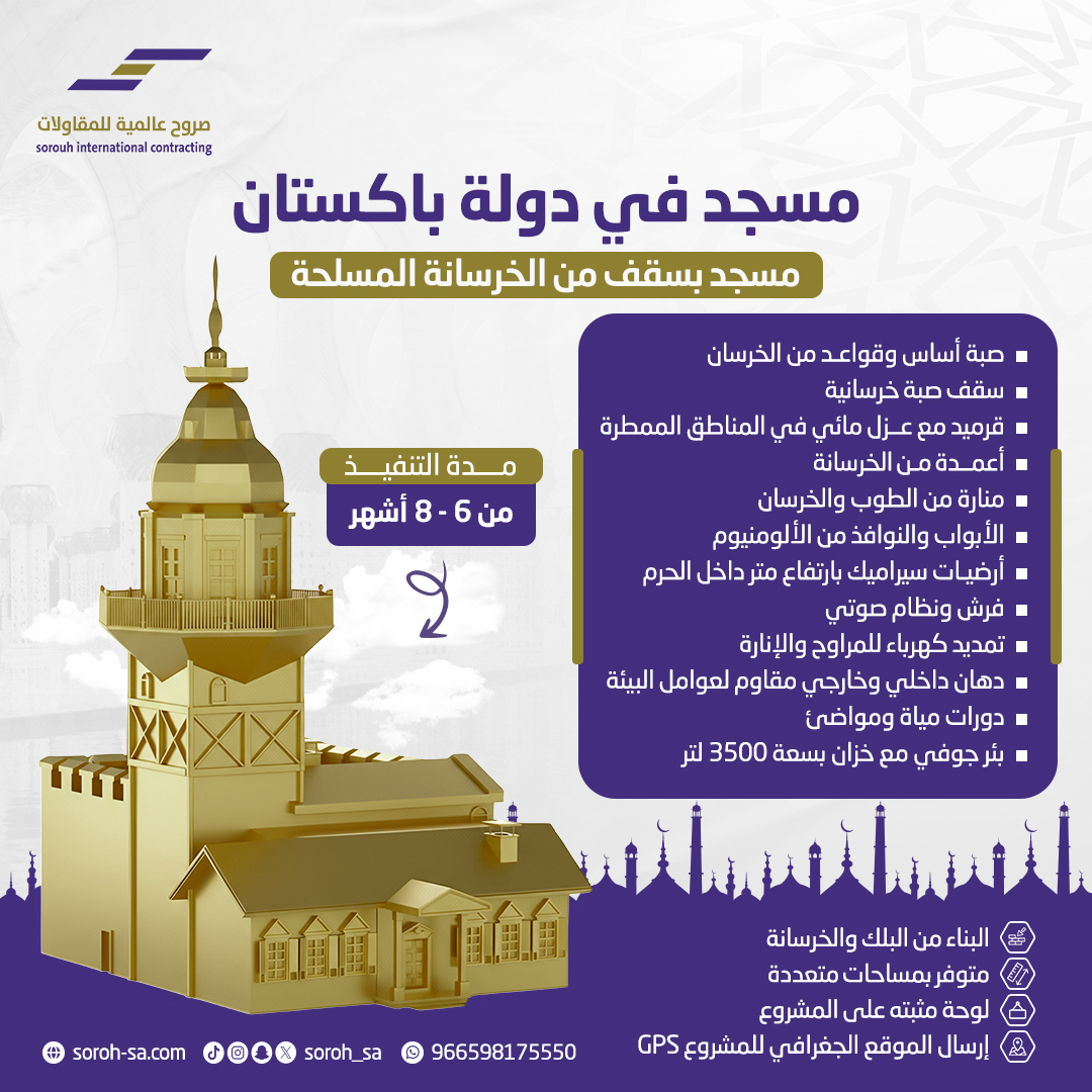 صبة اساس وقواعـد من الخرسان سقف جسور إسمنتیة قرمید مع عــــزل مائي في المناطق الممطرة أعمــدة مـن الخرسانة منارة من الطوب والخرسان الابواب والنوافذ من الالمنيوم أرضیــــــات سیرامیك بارتفاع متر داخل الحرم فرش ومایکرفون تمديد كهرباء للمراوح والانارة دهان داخلي وخارجي مقاوم لعوامل البيئة دورات مياة ومواضئ لوحة مثبتة على المشروع بئر جوفي مع خزان بسعة 3500 لتر